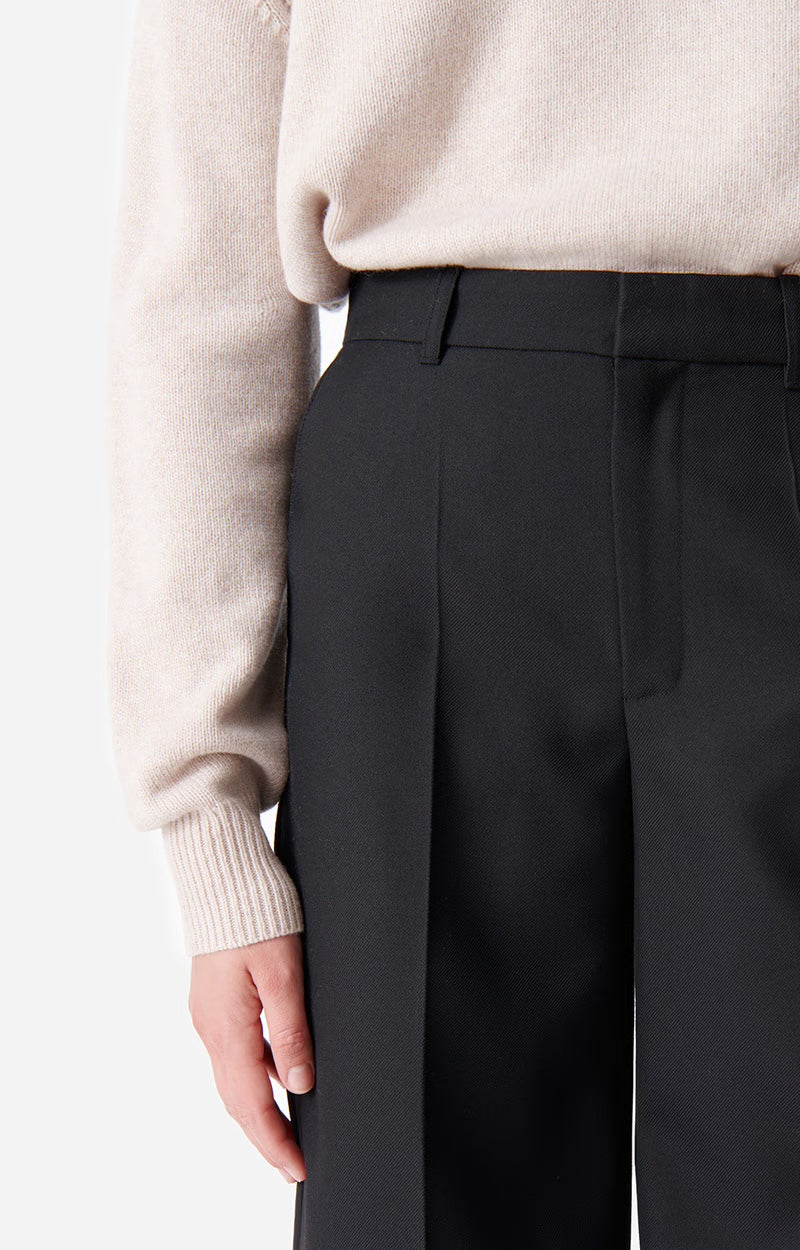 Sorte rette dressbukser med vide bein. Stikklommer i sidene og lommer bak. Lukkes med hempe og glidelås. En tidløs favoritt som passer til alt.